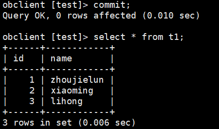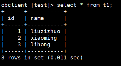 obclient [test]> update t1 set name='liuzizhuo_1-3' where id >= 1 and id <=3;