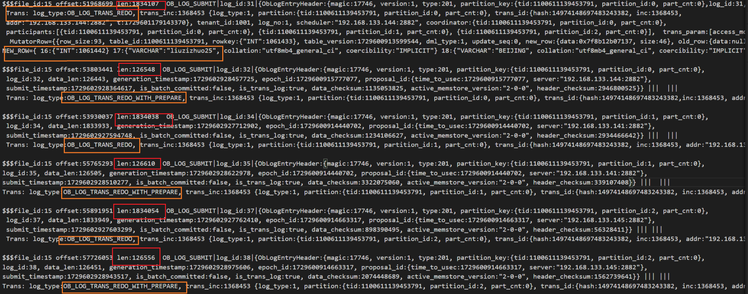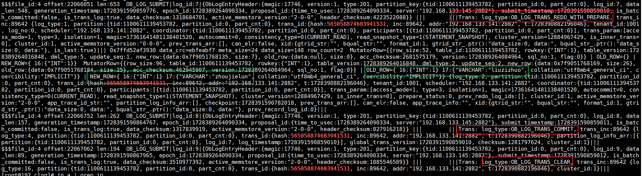 我们能够在每个节点的clog日志中都能发现4条ob_log_trans_redo_with_prepare,即一个分区对应了一条ob_log_trans_redo_with_prepare日志。同时发现相同epoch id的日志在每个节点都持久化了一份,每份日志内容都相同(除了物理地址和offset不同以外)。