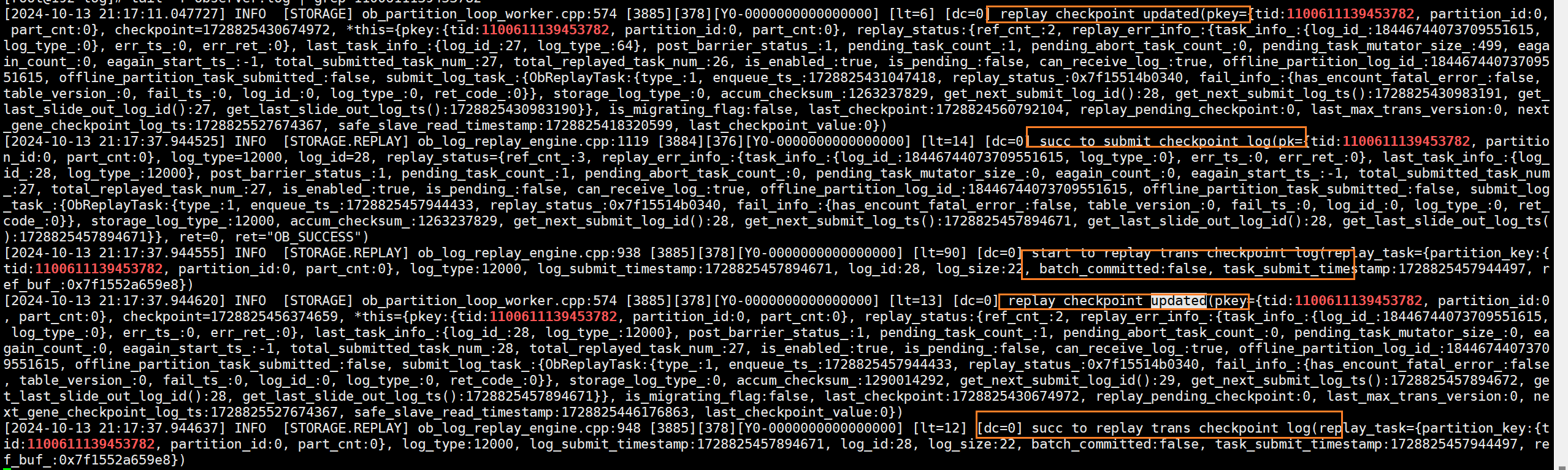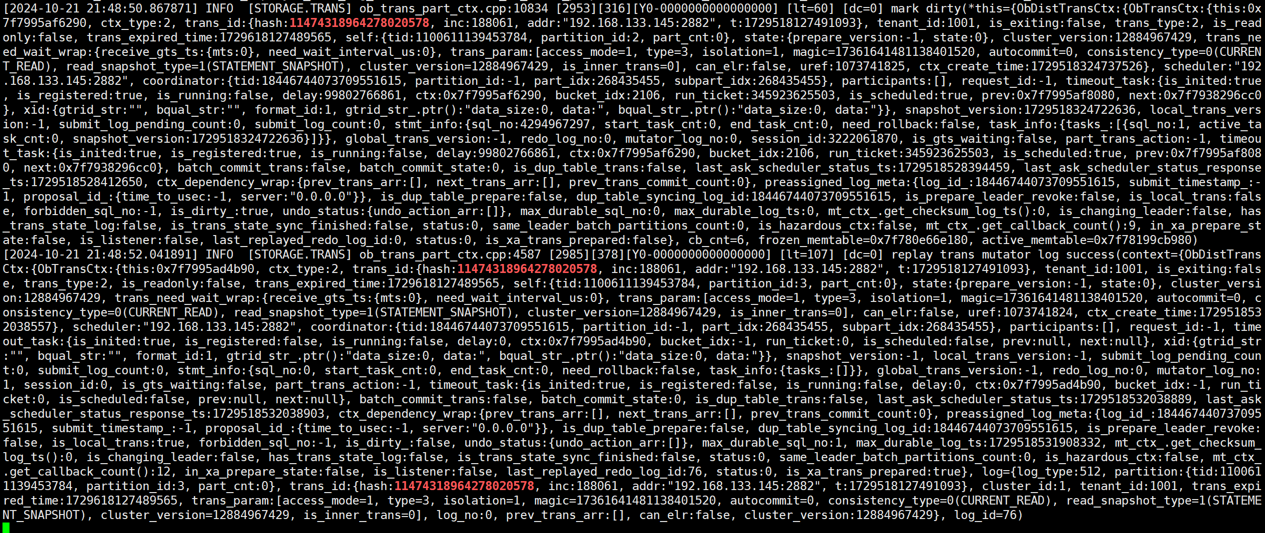 (8)在还未commit期间,根据事务id解析clog,发现很多类型为ob_log_mutaor的日志,该类日志记录了未commit期间所持久化并同步的redo,第(6)步看到的回放动作也是在回放这些redo记录。
