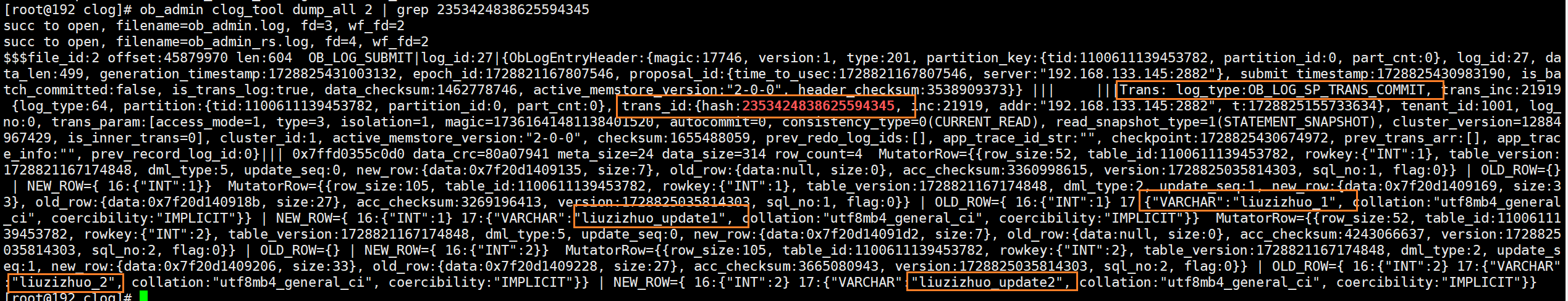 (7)再次根据事务id来grep 145节点的clog文件,发现文件中多出一条日志ob_log_sp_trans_commit,该条日志虽然是commit日志,但是其包含了本次事务对于表的修改记录。