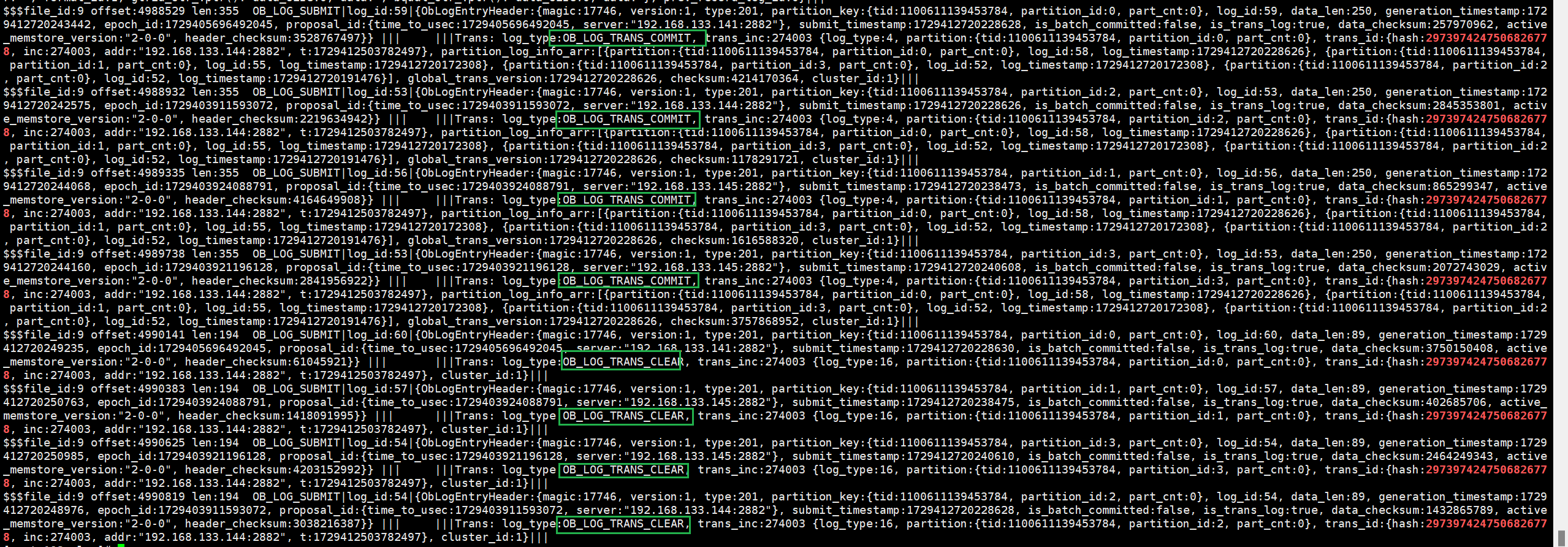 (8)日志很多拿了出来放在txt。单个节点的clog日志一共是3条mutator日志,1条是本地产生的clog,另外2条是其他分区leader传过来的,符合预期。