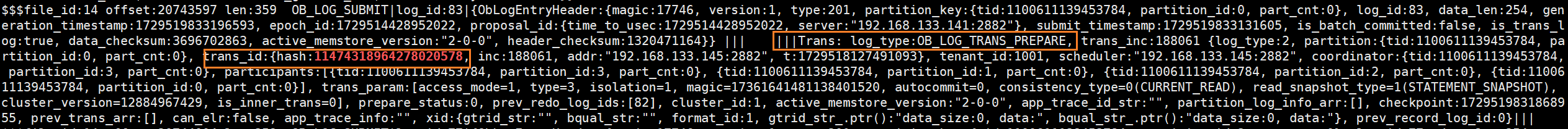 (6)再次根据事务id解析clog日志,可以看到日志类型为ob_log_trans_redo_with_prepare的日志,这一类型的日志是分布式事务的 prepare 日志,同时包含了本次事务的redo日志。从中还能够看到调度者scheduler为会话建立的节点144,协调者为141节点的副本,可见调度者和协调者不是同一节点,协调者则是第一个参与写操作的参与者,即分区p0(141节点)。