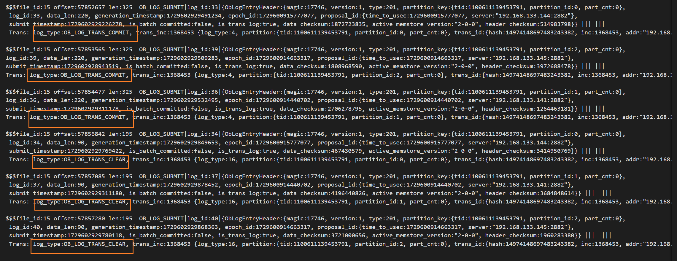 除了prepare with redo日志外,还有ob_log_trans_commit和ob_log_trans_clear,这就是ob两阶段提交各个参与者在pre-commit ok后所持久化的commit日志和clear日志。