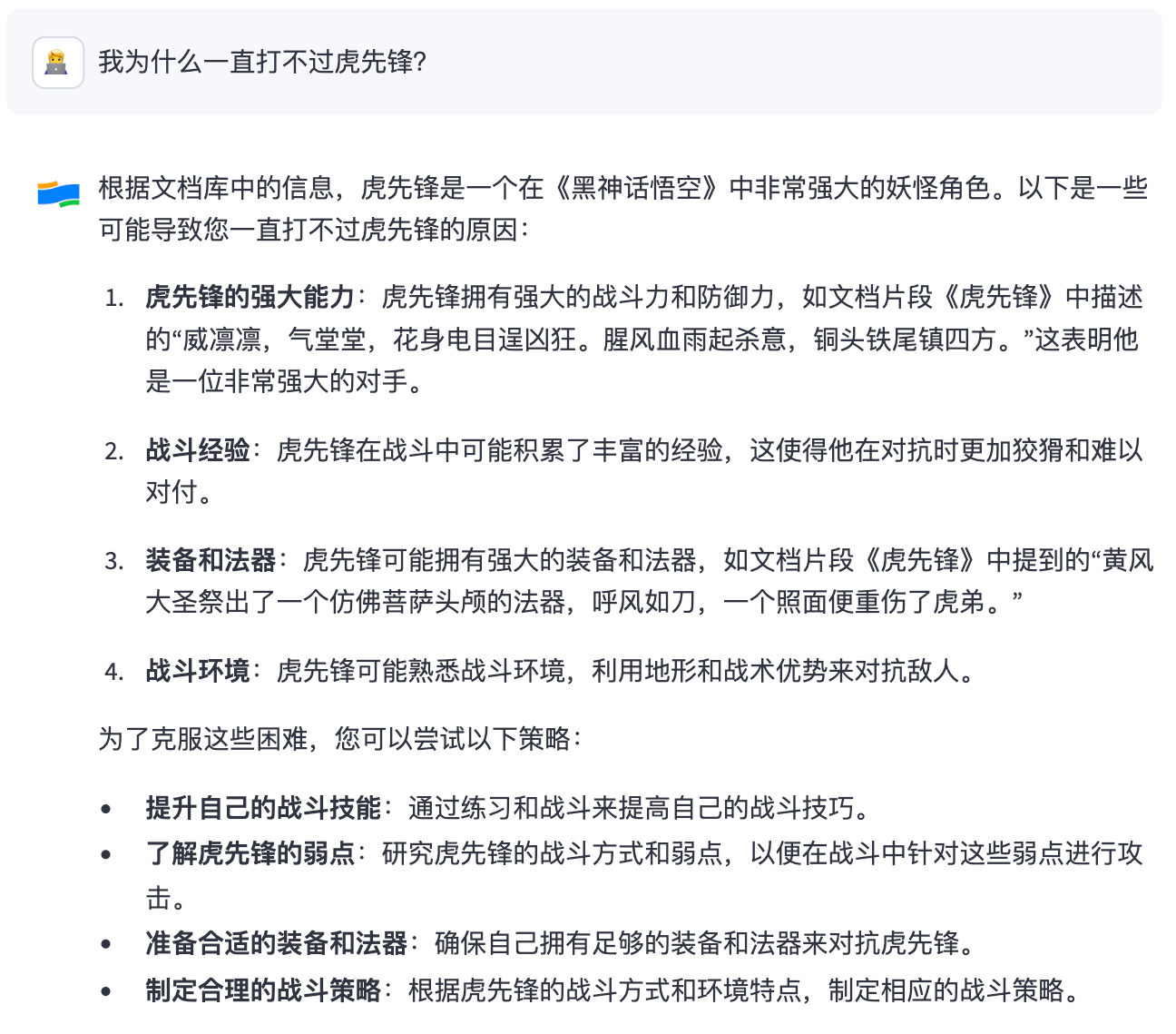 所以如果希望进一步提升这个游戏助手的智能程度,那就还需要更多的数据源作为输入,只靠《影神图》还是不够的。个人理解,如果要想让游戏助手回答上面的一个问题,指导玩家如何打赢敌人,至少还需要再导入 “战斗系统” 和 “游戏玩法” 的资料。