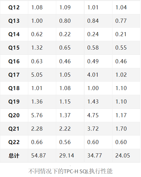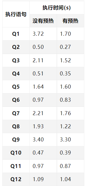 从上表测试数据可以看出,预热后tpc-h的测试sql语句执行性能会有一定的提升,是因为sql在解析与执行时命中了执行计划缓存与部分数据缓存所致。