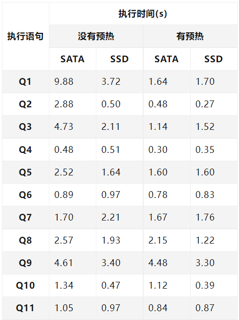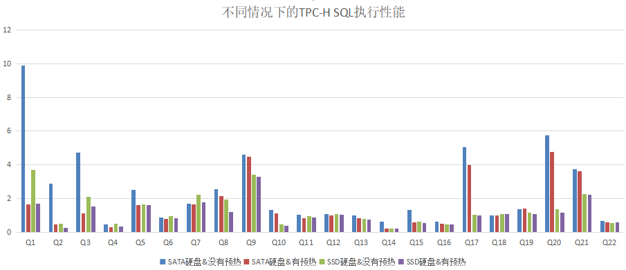 从以上测试数据可以看出,在没有预热的情况下,使用 ssd 硬盘比使用 sata 硬盘有较大的性能提升,但在有预热的情况下,使用 ssd 硬盘比使用 sata 硬盘的性能提升则不是很明显。因为在预热情况下 tpc-h 的测试 sql 语句在执行时命中了部分数据缓存,减少了从硬盘读取数据所带来的损耗。