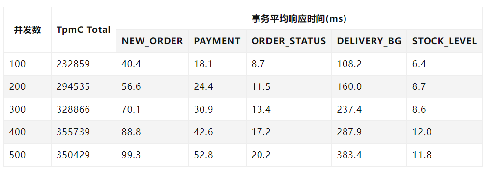 从以上测试数据可以看出,随着测试并发数的增加,由于 oceanbase 服务器集群资源负荷增大,事务平均响应时间会逐步增加,但总体 tpmc 会提高。但当测试并发数达到或超过临界点后,oceanbase服务器集群资源超出最大负载,总体 tpmc 反而会下降。